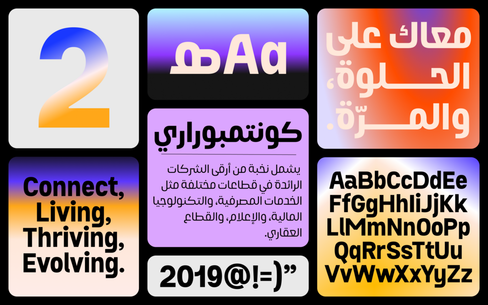 Khareef expresses a tension between compressed and wide shapes, blending full-rounded forms with more compact glyphs. This contrast injects a distinct rhythm and energy into the design. Every letterform is carefully crafted for legibility, especially in heavier weights, while stylistic alternates add personality without sacrificing functionality.